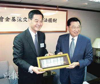 梁振英以香港專業(yè)聯(lián)盟主席身分,率領(lǐng)港交所、貿(mào)發(fā)局、國際仲裁中心等18名經(jīng)貿(mào)專業(yè)人士組團(tuán)訪臺,23日拜會(huì)“陸委會(huì)”、海基會(huì)、工業(yè)總會(huì)、商業(yè)總會(huì),由海基會(huì)董事長江丙坤、“陸委會(huì)”副主委劉德勛接見。