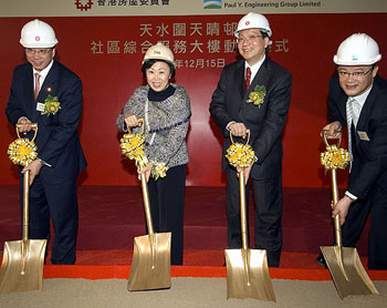 鄭汝樺15日在天水圍天晴村主持天晴社區(qū)綜合服務(wù)大樓動土儀式時表示,房屋委員會將加快建筑和維修保養(yǎng)工程以創(chuàng)造就業(yè)機(jī)會,并繼續(xù)致力協(xié)助低收入家庭解決住屋需要。