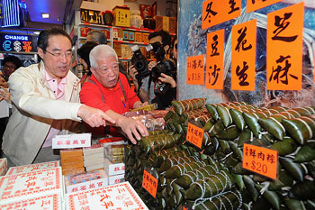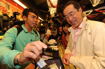 唐英年與多名官員及立法會(huì)議員到銅鑼灣的商店及餐館消費(fèi),鼓勵(lì)市民積極參與“促消費(fèi)、保就業(yè)”行動(dòng)。(圖片來源:香港特區(qū)政府網(wǎng)站)