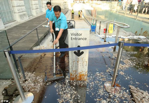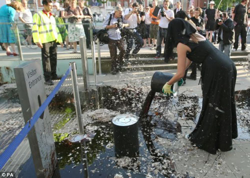 抗議者選擇泰德美術(shù)館開夏日聚會的時候,來到美術(shù)館門口表達自己的不滿,呼吁美術(shù)館盡快停止接受贊助。一些人手持印有BP字樣的原油桶,往美術(shù)館入口處的空地上潑灑石油和羽毛。頓時美術(shù)館門口滿眼狼籍,吸引了很多的過路人。
