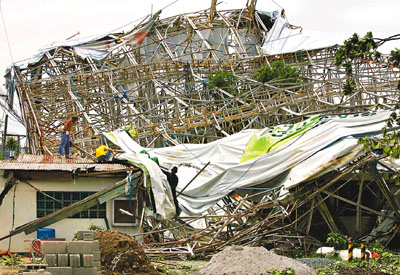 菲律賓群島位于西太平洋,平均每年遭受臺風和熱帶風暴襲擊20多次,去年風災造成43.8億美元經(jīng)濟損失。2009年9月底和10月,熱帶風暴凱薩娜和臺風芭瑪相繼吹襲菲律賓,引發(fā)嚴重洪災和山體滑坡,造成約1000人死亡。