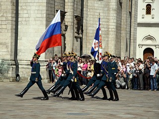 自2005年起,在氣候轉暖的4-10月,每逢周六中午克里姆林宮前就會進行總統(tǒng)衛(wèi)隊步兵和騎兵的換崗儀式。其中,每月的前三個周六在克里姆林宮廣場進行,剩下的在紅場進行。(梁旭)