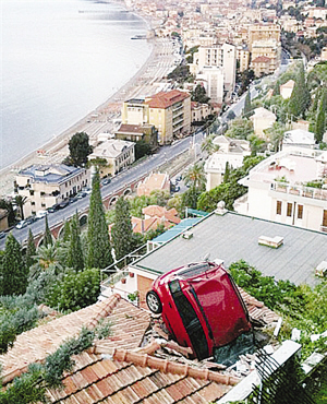 瑪麗亞光顧著拍照片,忘記拉手剎,結(jié)果車(chē)子從馬路上一路滑到了山底下,倒栽在一間民宅的屋頂上。