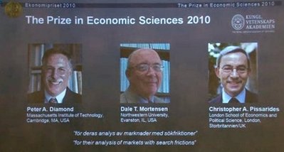 中新網(wǎng)10月11日電 據(jù)外電報(bào)道,瑞典皇家學(xué)院11日宣布,美國經(jīng)濟(jì)學(xué)家彼得·戴蒙德(Peter A. Diamond)、戴爾·默藤森(Dale T. Mortensen),塞浦路斯裔、英籍經(jīng)濟(jì)學(xué)家克里斯托弗·皮薩里德斯(Christopher A. Pissarides)三位學(xué)者共同獲得2010年諾貝爾經(jīng)濟(jì)學(xué)獎(jiǎng)。