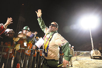第2名被救出的礦工馬里奧無疑是最激情四射的一位。馬里奧在快要到達(dá)井口時(shí)就開始與地面上的礦友喊起了玩笑話,聲音洪亮,充滿激情。在成功升井之后,馬里奧表情輕松的走下救生艙,與家人擁抱。他把含有金粒的礦石遞給救援人員表示感謝。