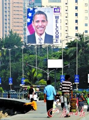 在孟買海邊的一條人行道上,張貼著“歡迎奧巴馬”的大幅海報(bào)。