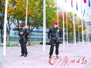 記者一到仁川國際機(jī)場,就能明顯感受到G20的氛圍。從仁川機(jī)場到首爾市區(qū),峰會的官方會徽青紗燈籠標(biāo)志到處可見。在G20首爾峰會的主會場COEX會展中心,全副武裝的特警在會場周圍24小時巡邏。