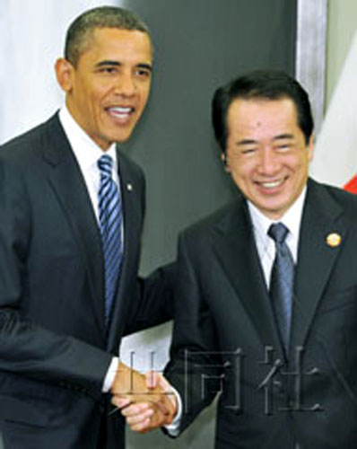 中新網(wǎng)11月13日電 據(jù)日本共同社13日?qǐng)?bào)道,日本首相菅直人13日上午在橫濱與來日參加亞太經(jīng)合組織(APEC)峰會(huì)的美國(guó)總統(tǒng)奧巴馬舉行會(huì)談。兩國(guó)首腦就進(jìn)一步“深化”同盟關(guān)系達(dá)成一致。會(huì)談結(jié)束后,奧巴馬向記者表示,美國(guó)將“毫不動(dòng)搖”地堅(jiān)持保衛(wèi)日本這一決心。