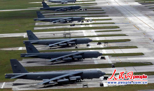目前美海、空軍在關(guān)島部署了大量的先進(jìn)武器裝備。美空軍在關(guān)島組建了一個“全球打擊特遣隊”,包括6架B-2隱形轟炸機(jī)、12 架KC-135空中加油機(jī)、48架F-15E戰(zhàn)斗機(jī)和1架“全球鷹”無人偵察機(jī)。同時,美國最先進(jìn)的隱形戰(zhàn)斗機(jī)“猛禽”F-22還定期飛往關(guān)島駐訓(xùn),且未來將永久部署關(guān)島。