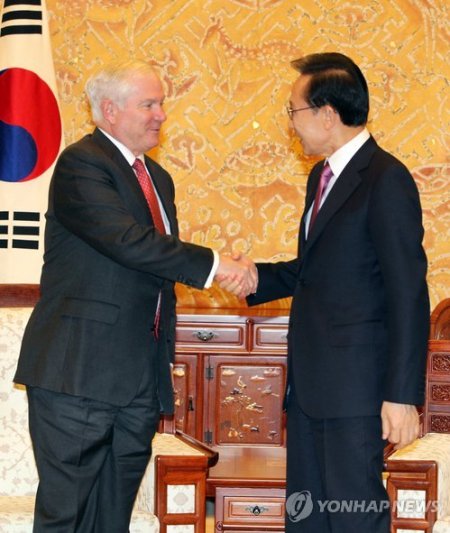 蓋茨向李明博詳細(xì)介紹最近他訪問中國和日本的結(jié)果。蓋茨說,同中日官員就朝核問題和東北亞局勢進(jìn)行了磋商。