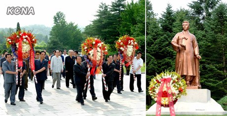 金正恩送來(lái)的花圈,擺放在金亨稷銅像和墳?zāi)骨。朝鮮勞動(dòng)黨中央委員會(huì)政治局常委金永南、崔永林、崔龍海,以及朝鮮各級(jí)領(lǐng)導(dǎo)干部、人民軍官兵、群眾和青年學(xué)生參加敬獻(xiàn)花圈儀式。