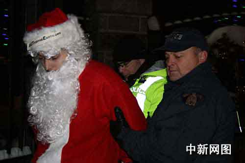 抗議行動(dòng)中,警察一共抓了7名環(huán)保人士,雖有肢體接觸但沒有任何人受傷。一排著紅衣服的“圣誕老人”把囚車塞得滿滿的,剩下一些舉著標(biāo)語(yǔ)牌的老弱婦孺在原地繼續(xù)游行。