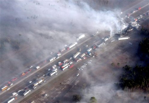 這起交通事故發(fā)生在佛羅里達州4號州際公路。在車禍發(fā)生之后,從坦帕到奧蘭多的一段大約15公里的路段已經被封閉。早先拍到的事故全景照片顯示,大霧和濃煙覆蓋了該區(qū)域數十公里,清晨天空出現了奇怪的金黃色景觀。