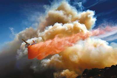 滅火飛機(jī)在山火地區(qū)投擲阻燃劑。
