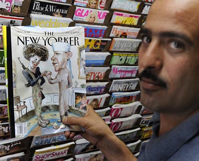 在本周《紐約客》封面上的這幅漫畫中,身穿穆斯林長袍的奧巴馬和打扮成恐怖分子的妻子在白宮的總統(tǒng)辦公室相互擊拳致意。總統(tǒng)辦公室的墻上掛著本拉登的畫像,壁爐里焚燒著美國國旗。