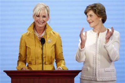 據(jù)美國媒體9月2日報道,第一夫人勞拉·布什和美國共和黨總統(tǒng)候選人麥凱恩的妻子辛迪成為共和黨全國代表大會首日的主角,她們主持了為“古斯塔夫”颶風(fēng)受害者籌集款項(xiàng)的活動。共和黨全國代表大會9月1日在明尼蘇達(dá)州首府圣保羅市開幕。