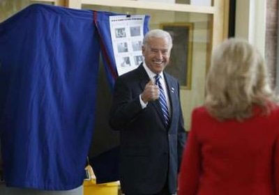 中新網(wǎng)11月5日電 綜合報(bào)道,當(dāng)?shù)貢r(shí)間11月4日,美國(guó)民主黨副總統(tǒng)候選人拜登在特拉華州威爾明頓附近的塔特納爾學(xué)校參加大選投票。