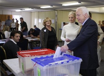 而那邊廂,麥凱恩也在妻子辛迪的陪同下在亞利桑那州進行了投票。在民調中落后的麥凱恩被100名媒體人員所包圍,但他沒有回答記者們提出的問題,其中包括:“你睡得如何?”他隨后離開了鳳凰城的投票站。