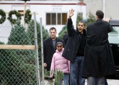 奧巴馬當(dāng)天帶兩個(gè)女兒和女兒的一個(gè)朋友,到芝加哥南區(qū)一個(gè)圣誕樹市集上,物色今年家里要用的圣誕樹。