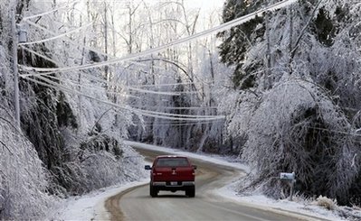 12月14日,緬因州,一輛卡車駛過兩側(cè)樹木被冰覆蓋的車道。