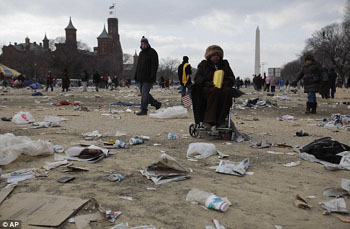 日前美國將使用衛(wèi)星在空中拍攝到華盛頓國家廣場照片,和奧巴馬總統(tǒng)就職后的進(jìn)行對比。從照片上可以看到在就職典禮當(dāng)日,國家廣場上覆蓋了白色垃圾,這些垃圾大部分是宣傳紙、報紙、塑料瓶子、食物包裝紙、一次性咖啡杯,甚至還有美國國旗。