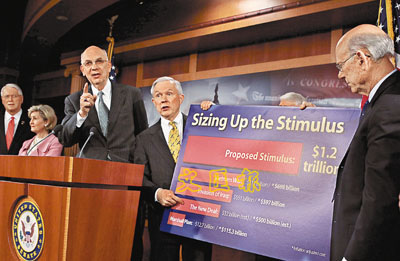 刺激經(jīng)濟(jì)方案上周在眾議院表決時(shí),竟然得不到任何一位共和黨議員支持,對(duì)尋求打破黨派藩籬的奧巴馬而言是沉重打擊。以目前參院的勢(shì)力分布,民主黨若拉攏不到任何共和黨議員倒戈,共和黨便可采取阻延策略阻撓方案。