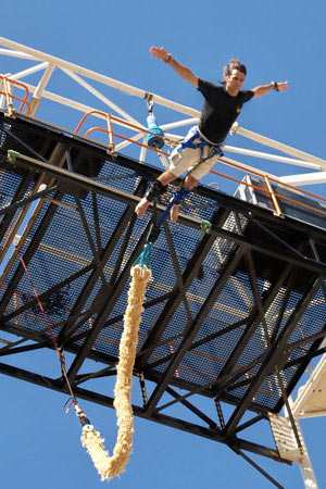 南非擁有世界上最高的蹦極點,熱衷蹦極的人們常常在南非找刺激。近日,一位另類的蹦極手創(chuàng)下了蹦極運動的新紀(jì)錄:37歲的葡萄牙男子卡爾·迪奧尼西奧用1.85萬個安全套做成30米長的彈性繩,代替?zhèn)鹘y(tǒng)尼龍繩跳下蹦極臺,將“生死一線牽”的感覺發(fā)揮到極致。