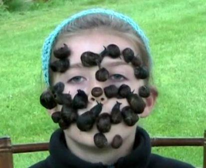 現(xiàn)年9歲的狄安娜•沃爾頓,喜歡動物。當25只蝸牛在她的眼睛、鼻子以及嘴巴上橫行時,她絲毫不害怕。由此,她打破了由澳大利亞人Liam Kenny支前保持的15只蝸牛上臉的前世界紀錄。