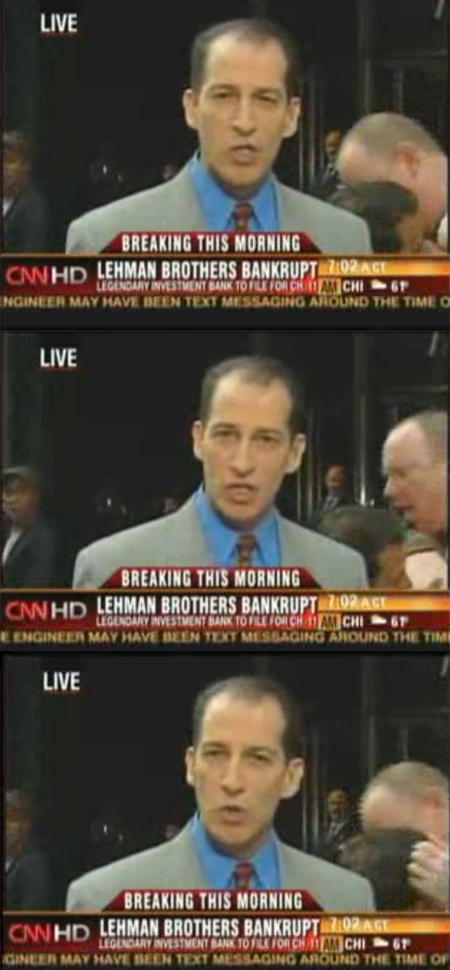 據(jù)韓國《朝鮮日報(bào)》報(bào)道,14日凌晨(當(dāng)?shù)?美國有線電視頻道CNN以緊急新聞的形式報(bào)道了雷曼兄弟公司向法院申請破產(chǎn)保護(hù)的消息。該新聞是以在直播間與趕赴紐約時代廣場雷曼公司總部的CNN現(xiàn)場記者直播連線的方式播出的。