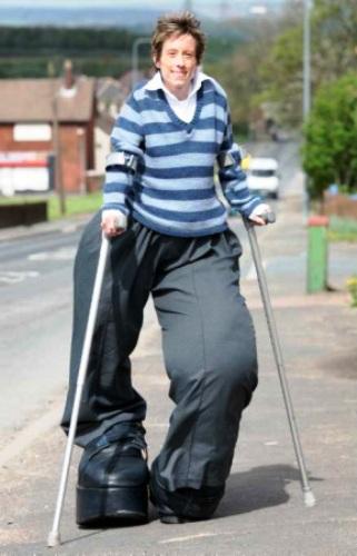 讓她的家人驚訝的是,她在整個(gè)童年時(shí)期,兩條腿的生長速度都一直比其它身體部位快!最后她再也不能獨(dú)立行走了,F(xiàn)在她要借助拐杖,或者借助一輛經(jīng)過特殊改裝的汽車才能出行。塞拉斯的家在英格蘭西北部,她一直找她們家附近的一位鞋匠定做鞋子,因?yàn)樗膬芍荒_也畸形發(fā)育,右腳長16英寸(40.64 厘米),寬7英寸(17.78 厘米),但是她的左腳長僅有11英寸(27.94 厘米),而且整個(gè)腳是反長的。不僅如此,塞拉斯的兩條腿長度也不一樣。因此每定做一雙鞋,她都要仔細(xì)試穿,反復(fù)試穿直到最后確定鞋樣,整個(gè)過程需要花費(fèi)幾周時(shí)間。定做這樣一雙鞋的費(fèi)用大約是4000美元,塞拉斯必須籌集這些錢,因?yàn)樗龥]有工作。