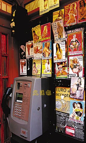 有關(guān)英國倫敦妓女的宣傳貼紙滿布電話亭。 (資料圖片)