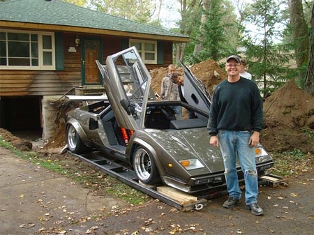 據(jù)俄羅斯新聞網(wǎng)報(bào)道,這名美國人在自家地下室,用時17年手工打造出自己的超級蘭博基尼跑車。但如何從地下室脫出跑車又成一問題,為此Imhoff不惜墻倒屋塌,專門找來掘土機(jī)在自己房屋下開出一個大洞,成功將跑車?yán)鰜。在這個過程中,他唯一擔(dān)心的是砸下了的石頭會否砸壞他的愛車。