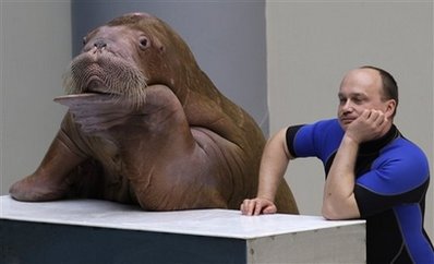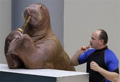雌性海象“薩拉”在它的俄羅斯籍訓(xùn)練員謝爾吉指示下,用一只鰭足撿起一件類似簫的銅管樂器吹奏。