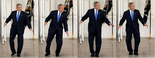 2008年3月5日,在獲得黨內(nèi)提名所需的1191張黨代表票后,美國(guó)共和黨總統(tǒng)候選人約翰·麥凱恩前往白宮,與總統(tǒng)布什共進(jìn)午餐,作為布什正式宣布支持他的前奏。但布什卻被麥凱恩晾在白宮北門等了好一會(huì)兒。早早來(lái)到白宮北門的布什左等右等麥凱恩不到,為了調(diào)節(jié)氣氛,竟然在眾位記者面前獨(dú)自跳起踢跶舞來(lái)。