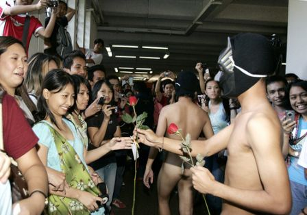 當(dāng)天,菲律賓大學(xué)校園內(nèi),由該校兄弟會組織的39名男學(xué)生頭戴面具集體裸奔,并向一路驚叫的女生送玫瑰。