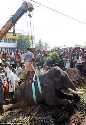 據(jù)英國《每日郵報》4月1日的報道,周二,印度喀拉拉邦一頭公象在交通繁忙的公路上被一輛卡車撞到,兩條后腿骨折和背部受傷,獸醫(yī)不得不動用起重機來搬運這個“龐然大物”。據(jù)報道,這頭大象高9英尺(約2.7米),重達6噸,剛剛從附近的一家印度教寺廟逃出。在事發(fā)現(xiàn)場,數(shù)百名觀眾正在觀看獸醫(yī)如何救治受傷的大象和如何將它搬離現(xiàn)場。一名獸醫(yī)表示,這頭大象體型龐大,情緒極不穩(wěn)定。不過,它此前一直生活在附近人來人往的寺廟,所以對人并不十分恐懼。在對大象做過全面評估后,他們決定從附近的建筑工地上征用一輛起重機,將這頭大象吊到卡車上,將它運往一家獸醫(yī)醫(yī)院。據(jù)悉,搬運工作進展得十分順利。不過,令人可悲的是,盡管獸醫(yī)在努力救治這頭大象,但由于它的傷勢過于嚴重,于當天晚間死去。