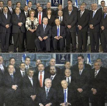 近日,以色列新內(nèi)閣剛剛舉行了就職儀式。不過兩家猶太極端主義報(bào)紙卻打著“與傳統(tǒng)宗教信仰的信條相契合”的幌子,偷換了以色列新內(nèi)閣就職儀式合影照中兩位女性官員的形象,取而代之的是兩位不知名的男士。