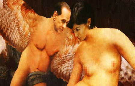 在潘塞卡的這幅作品中,貝盧斯科尼化身赤裸著身體的天使,用巨大的翅膀親昵地?fù)е獯罄麢C(jī)會(huì)平等事務(wù)部長瑪拉·卡爾法尼亞,含情脈脈地盯著自己的女部下。