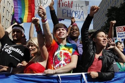 中新網(wǎng)10月12日電 數(shù)千名反對(duì)歧視同性戀的活動(dòng)人士11日在美國(guó)首都華盛頓游行,呼吁給與同性戀者平等的民事權(quán)利。
