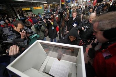 第三屆“大掃除日”(Good Riddance Day)前天在紐約時報廣場(Times Square)舉行,現(xiàn)場碎紙機轉個不停,一年來的厄運也象征性的一掃而空。