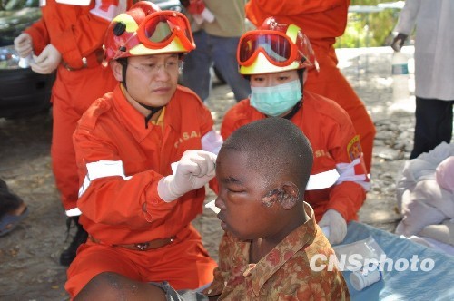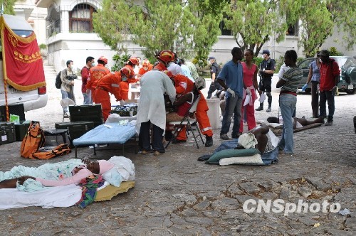 海地當(dāng)?shù)貢r(shí)間14日9時(shí),中國(guó)武警總醫(yī)院赴海地國(guó)際救援醫(yī)療分隊(duì)開設(shè)第一個(gè)流動(dòng)醫(yī)療點(diǎn),已為110名受傷的災(zāi)民提供醫(yī)療救助。海地總理禮賓官趕到醫(yī)療救助點(diǎn),他握著來自中國(guó)武警總醫(yī)院的醫(yī)生的手說:“感謝中國(guó)國(guó)際救援隊(duì),你們是第一支來總理府進(jìn)行人道主義救助的救援隊(duì)”。