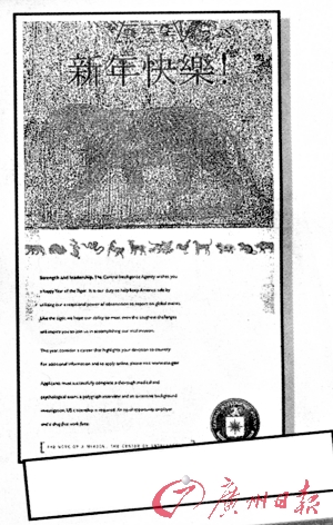 CIA還首度以中文“新年快樂”向華裔民眾拜年,廣告畫面上還配有一只威風(fēng)凜凜的老虎,中國味濃厚,備受矚目。