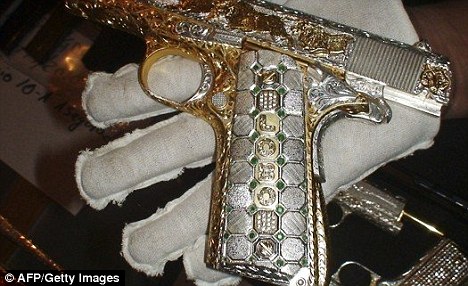報道說,有3支沖鋒槍幾乎整個槍身都包覆黃金,并有一枝黃金制作的滅音器。一名顯然特別注重形象的幫派份子,他的手槍更是獨(dú)一無二,槍上鑲嵌了整排華麗的紅綠寶石和一個法拉利(Ferrari)徽記。