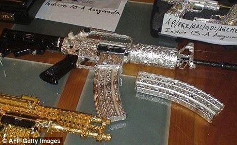 據(jù)報道,這些槍支顯示了幫派奢華份子如何花用他們不法的財富。照片顯示軍方在墨西哥西部一次突擊行動中,起出31支槍,大部分外表都包覆著黃金或白銀外皮,或鑲嵌著許多閃閃發(fā)光的鉆石。