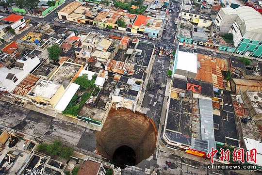 此外,受連場暴雨影響,危地馬拉城一處出現(xiàn)地面下陷,形成一個深60米、直徑30米的地洞。據(jù)報道,這個巨大地洞吞噬了一幢3層高大廈,1人死亡。