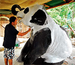 這張照片配上標(biāo)題“泰國大象只能露齒微笑并忍受”,特別引人深思。報道說,水彩對大象無害,大象似乎也不介意。工人慢慢地在大象身上仿造全國對熊貓的狂熱。