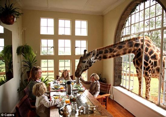 每天快到九點(diǎn)時,這些長頸鹿就把腦袋伸進(jìn)窗戶里,等待主人準(zhǔn)備他們的早餐。這種羅斯切爾德長頸鹿是長頸鹿中的第二大瀕危種群。妻子坦雅說:“這個莊園以前的主人在長頸鹿的繁育方面做得很成功,我們也將繼續(xù)下去!