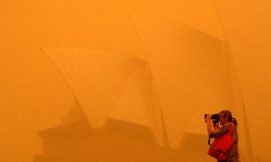 澳洲東部星期三遭遇數(shù)十年來最嚴重的沙塵暴,悉尼市被覆蓋,交通受阻。強風把數(shù)以噸計的紅色沙塵傾倒在澳洲最大城市悉尼,使悉尼覆蓋在怪異的赤色迷霧中,著名悉尼歌劇院被涂上一層厚厚的沙塵。