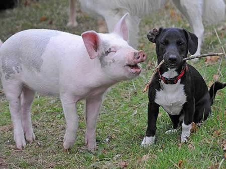 據(jù)臺灣東森新聞網(wǎng)報(bào)道,英國一動物庇護(hù)站人員表示,小豬剛被收養(yǎng)時(shí),因?yàn)槿菀咨,所以就把它放養(yǎng)在房子周圍,以方便觀察病情。沒想到它很快就與周圍的小狗打成一片。小豬剛進(jìn)來的時(shí)候體型只有小狗的一半,5周后就比小狗大上了2倍。