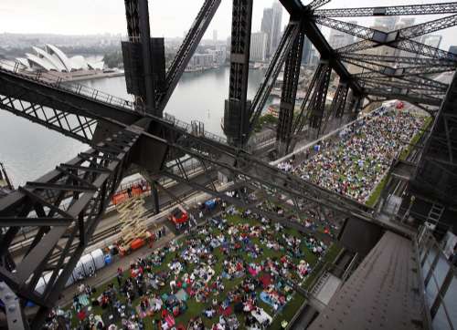 據(jù)香港大公網(wǎng)報道,當?shù)谝豢|陽光照射在悉尼港大橋上時,等待已久的人們井然有序地開始從北岸上橋。他們有的全家出動,有的呼朋結(jié)伴,有的老人甚至坐著輪椅趕來。在大橋的入口處,一些音樂家在演奏,為早餐會助興。組織者還特地從農(nóng)場運過來十多頭奶牛,為來賓現(xiàn)場擠牛奶。